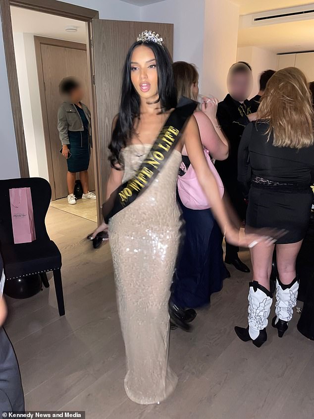 Dressed to the nines in her evening gown, she featured plenty of skin on display, intricately detailed attire, and also had flowers, balloons, cakes, music, and booze.