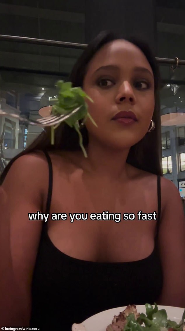The footage begins with a 21-year-old eating her meal and right before she is chastised by the date for eating way too fast.