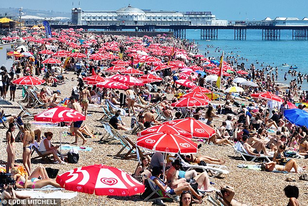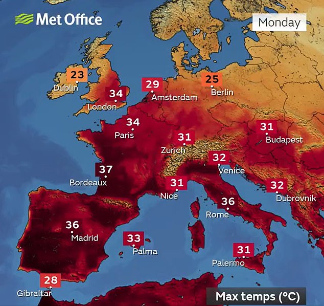 Britain was similarly sweltering in near record-breaking temperatures, with sunseekers across the nation heading towards the seaside to cool down. The southeast recorded the highest figures with the mercury levels hitting 34 degrees centigrade on Monday afternoon.