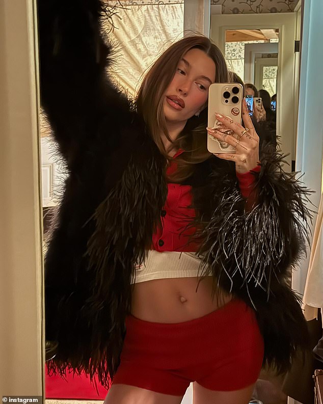 Hailey also shared several snaps about how she was enjoying a date night with the baby hitmaker for the romantic holiday. In one picture, Justin was seen posing shirtless to show off the huge number of tattoos across his chest while sporting a patterned tie.