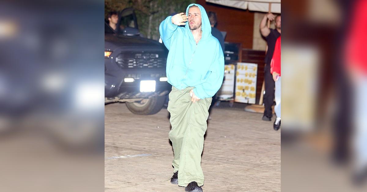 The Baby singer was dressed in an oversized aqua hoodie, baggy green pants, and some leather woven shoes in black.