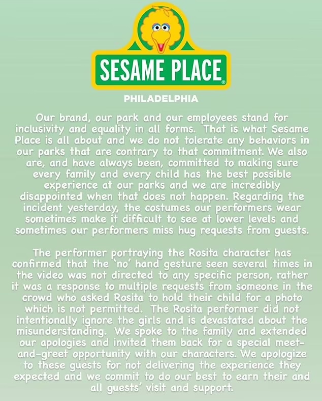 The park further insisted that Rosita made the ‘no’ hand gestures several times – directed at no one in specific – after a mother in the group asked for the mascot to carry her child. The mascots are according to the park not permitted to carry children to avoid accidents.