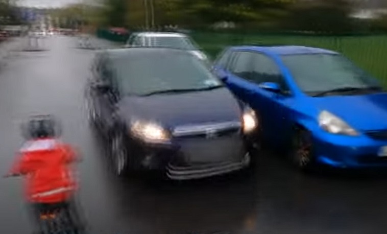In the video, the car coming from the other direction is seen ‘squeezing’ through the road blocked by a parked car on one side and the boy and his father on the other.