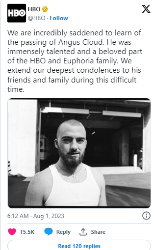 HBO also paid tribute to the actor on social media writing: “We are incredibly saddened to learn of the passing of Angus Cloud. He was immensely talented and a beloved part of the HBO and Euphoria family. We extend our deepest condolences to his friends and family during this difficult time.”