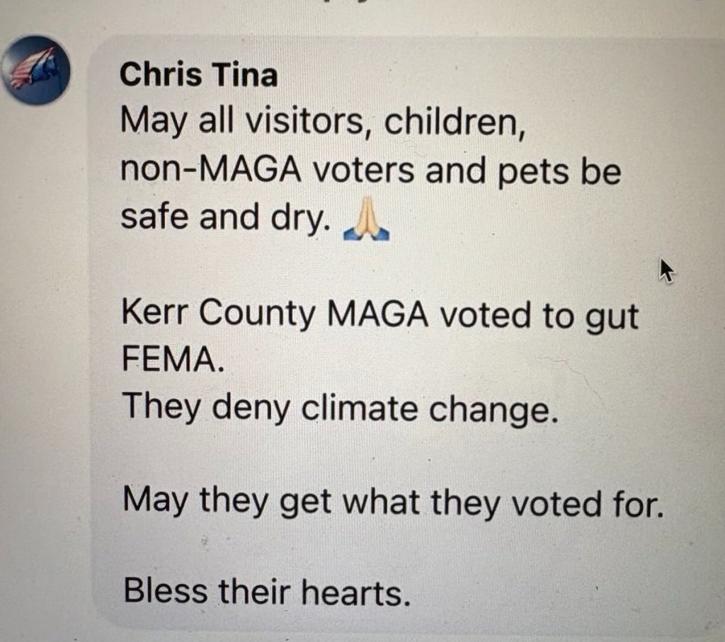 Since then, the post has been removed, and she’s been fired, but she has posted again in which she sent out heartfelt wishes and prayers to visitors and kids as well as non-MAGA voters, hoping and praying for their pets to be safe and dry.