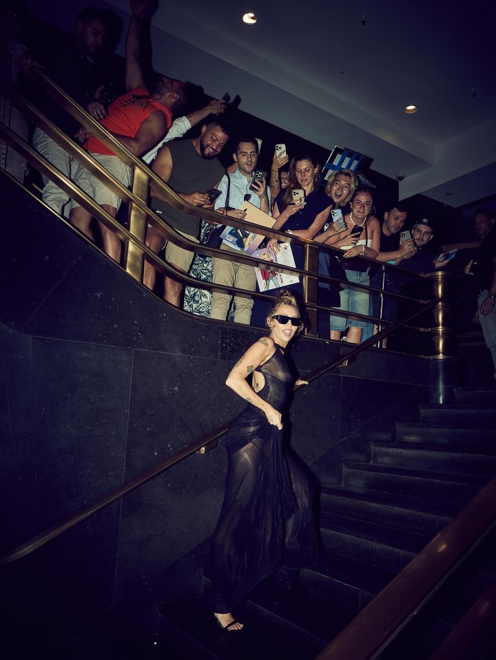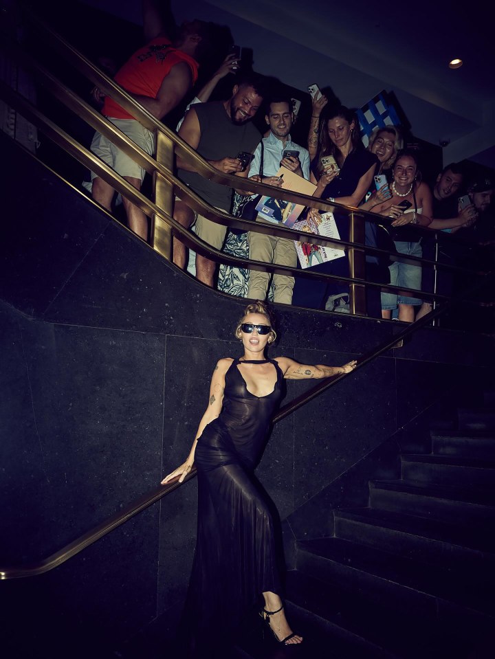 Sweeping her hair up in a bun on top of her head, Miley completed the figure-hugging style with a pair of aviator-style shades. Posing for photos against a backstage grate, Miley was also seen on a staircase, posing in front of fans as they waited above her to meet.