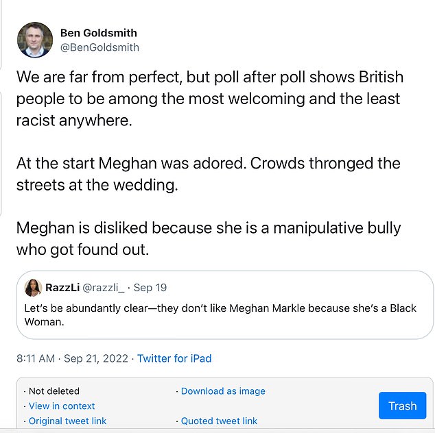 Meghan Markle is being slammed by Ben Goldsmith, who appears to have zero sympathies whatsoever for the Duchess of Sussex.