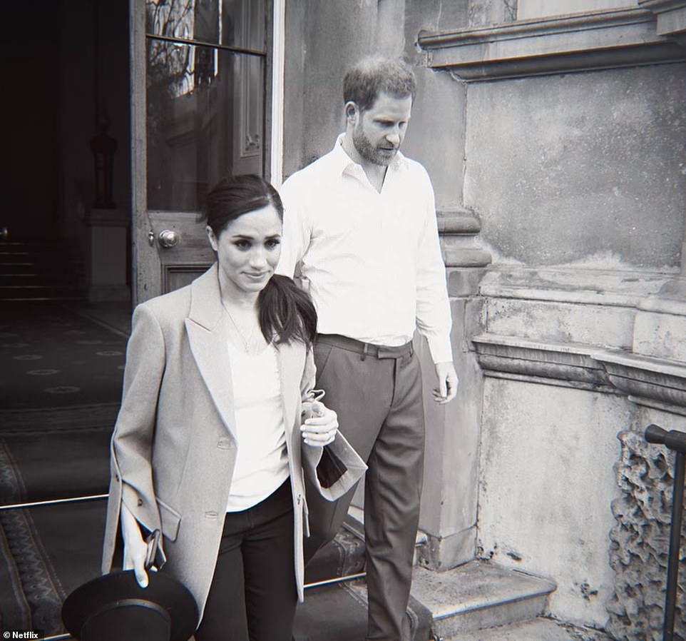 The first episode begins with a thinly-veiled attack on Buckingham Palace’s decision to not cooperate with the six-part documentary that charts their courtship, marriage, as well as their exit from the firm.