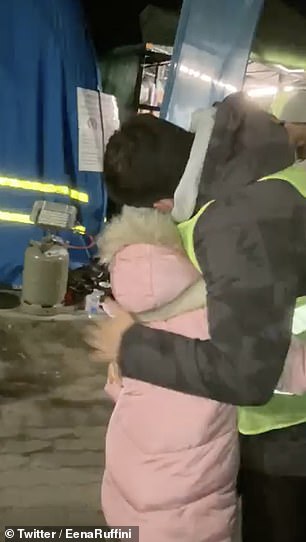 The girl can then be seen hugging one man wearing a high-visibility jacket.