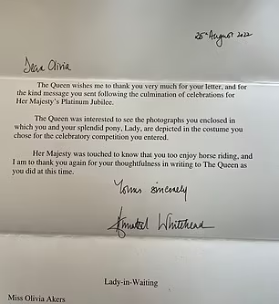 “The Queen was interested to see the photographs you enclosed in which you and your splendid Pony, Lady, are depicted in the costume you chose for the celebratory competition you entered,” the letter read.