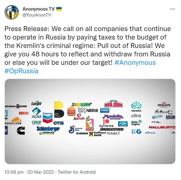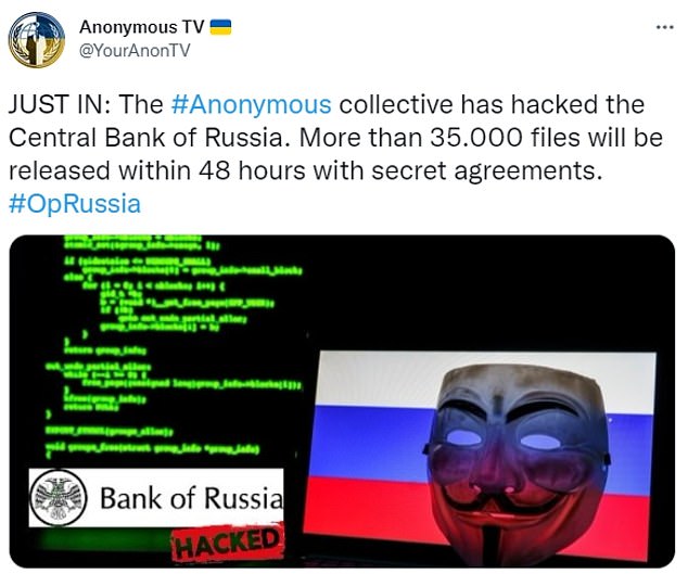 “JUST IN: The Anonymous collective has managed to hack the Central Bank of Russia. And more than 35,000 secret files will be released in the next 48 hours, along with a number of secret agreements too.”