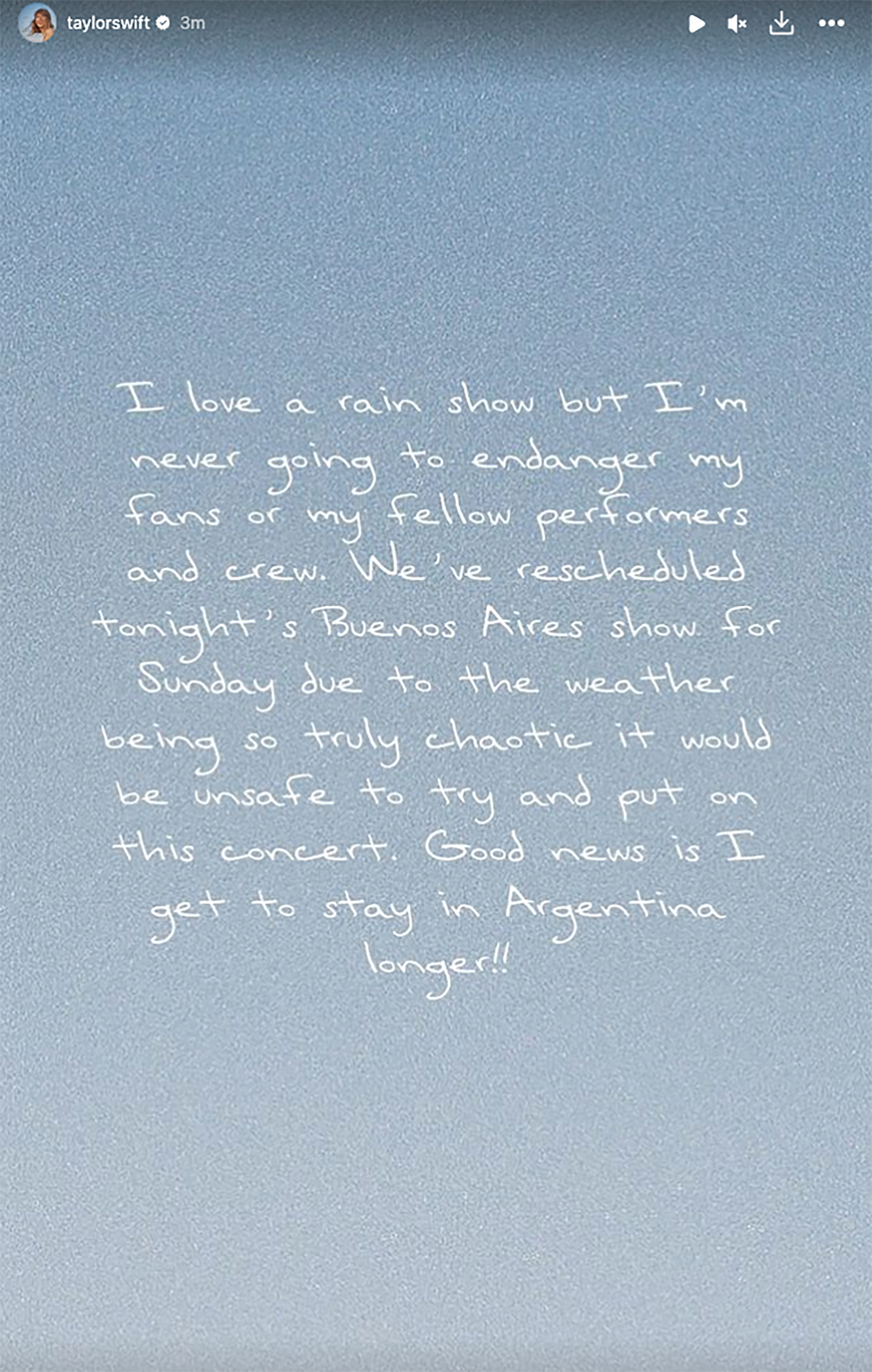 Swift boldly declared on social media how she adores the thought of having a rain-based show. But she would similarly never ever opt to put her fans in danger nor endanger her team members which include crew and staff that help her make the magic happen on-stage.