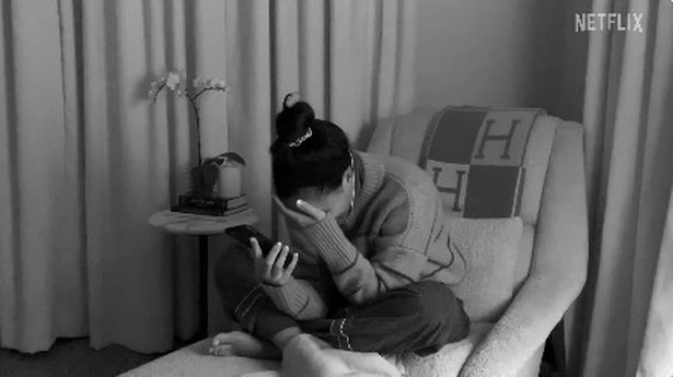 Meghan can be seen crying and wiping her tears while Harry tries to push himself back on the sofa.