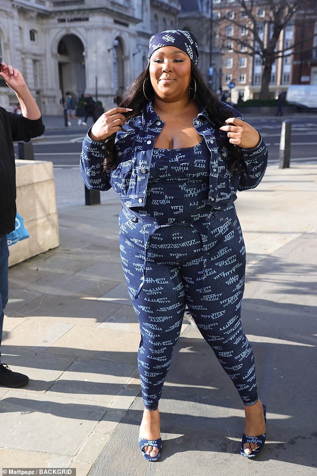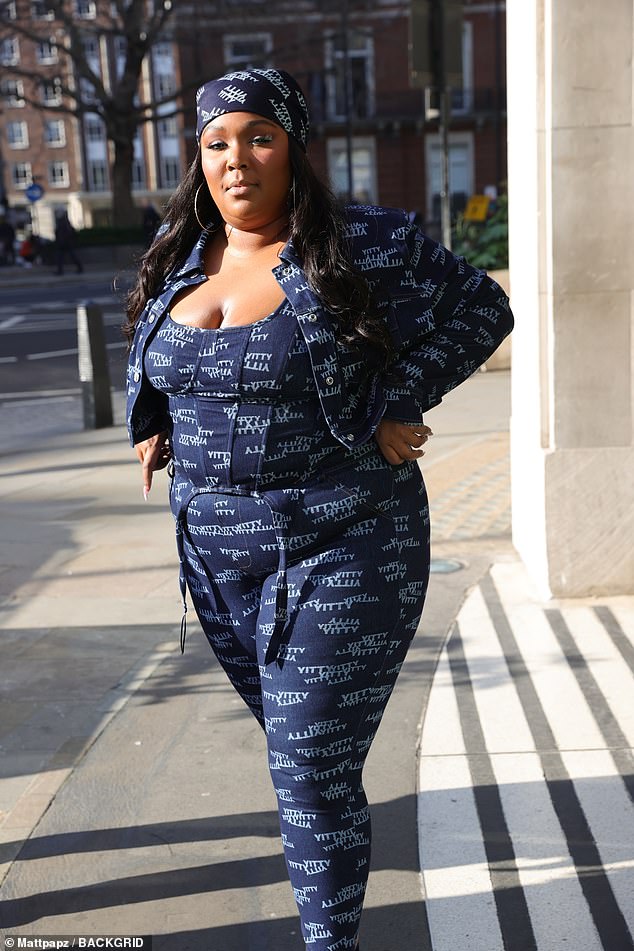 For this particular look, Lizzo donned a pair of jeans. matching corset, a cropped jacket, and a print design in the white of her brand’s name.