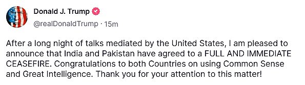 The news comes just hours after Donald Trump boasted that a ceasefire with Pakistan had been reached.