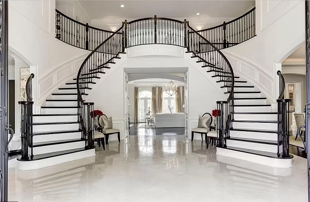 A listing for the mansion describes the property as “one of the most distinctive and private estates offered in McLean.” It boasts a two-story grand Foyer with a stylish double curved staircase.