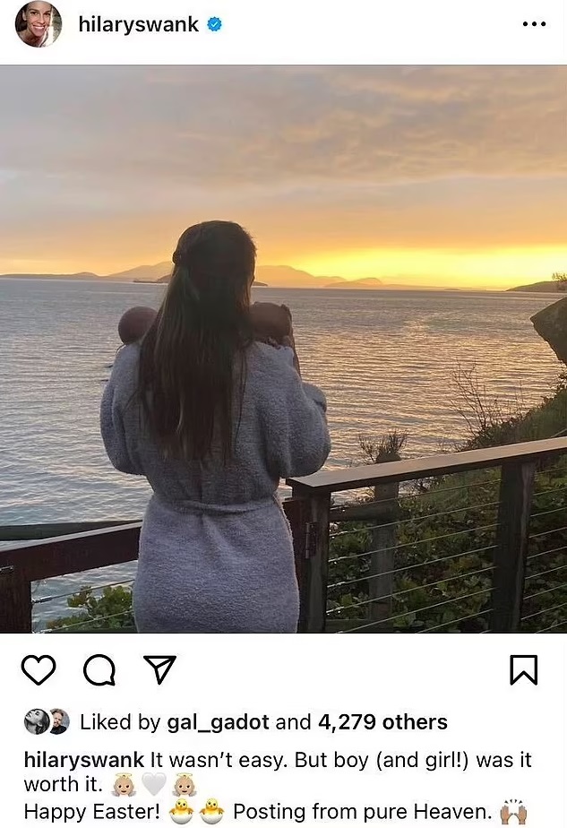 Hilary also shared a sweet photo showing her cradling her two bundles of joy, one in each arm, while watching the sunset from what appears to be the patio at her home.