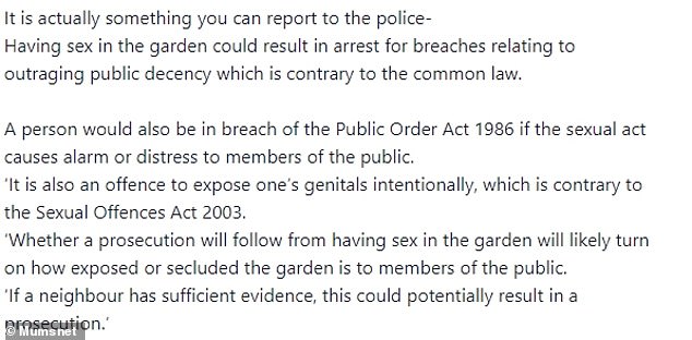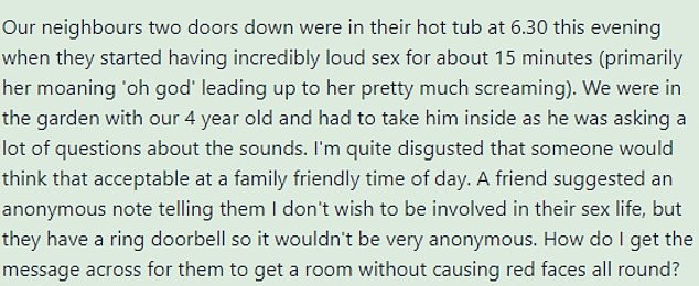 This next story involves a neighbor who is tired of hearing those next door engage in intimacy for hours on a routine basis. It’s become so hard for her to step into her garden because that’s where the sounds are so audible.