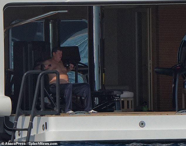 The businessman was seen looking tanner than ever as he enjoyed soaking up some European sun and the could be seen strolling aboard his deck, moments after he got done with his workout.