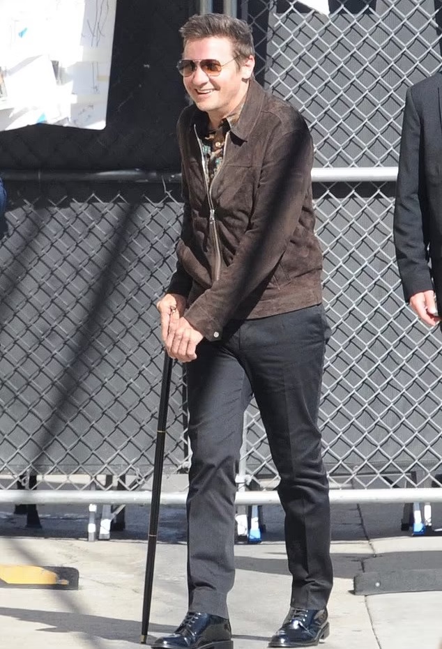 Leaning on his walking cane while sporting stylish shades, Renner smiled from ear to ear as he was escorted to the late night show studio in dark brown suede top and black pants.