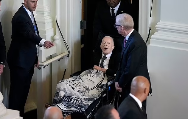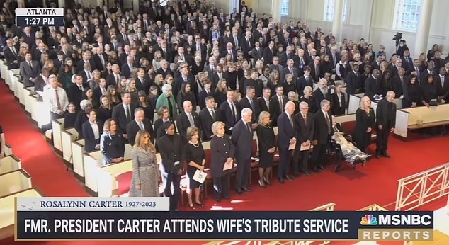 Jimmy Carter was spotted at late wife Rosalynn’s memorial service in Georgia after briefly leaving hospice care to attend the emotional event.