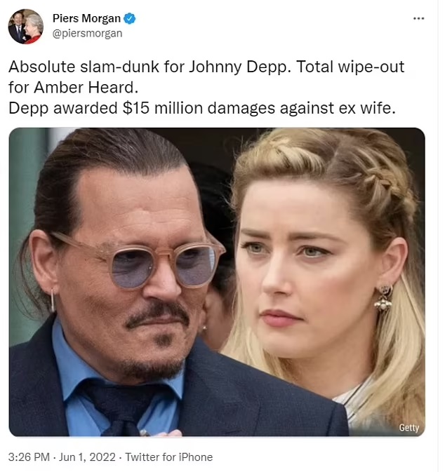 Weighing in on the matter was also British commentator and broadcaster Piers Morgan who called the verdict an “absolute slam-dunk for Johnny Depp” and a “total wipe-out for Amber Heard.”