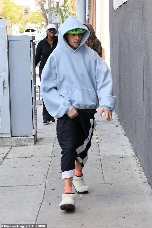 This is where he was spotted making his way to a spa after sporting a gray hoodie over his unique green beanie. The father of one was seen completing his comfortable look with long shorts and some orange socks and a pair of fuzzy white boots.