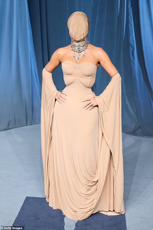 The dress featured nude tones, strapless corsets, and came fully draped with sleeves. The standout feature was a full face covering that comprised a nude-toned mask that concealed her hair and many facial features.