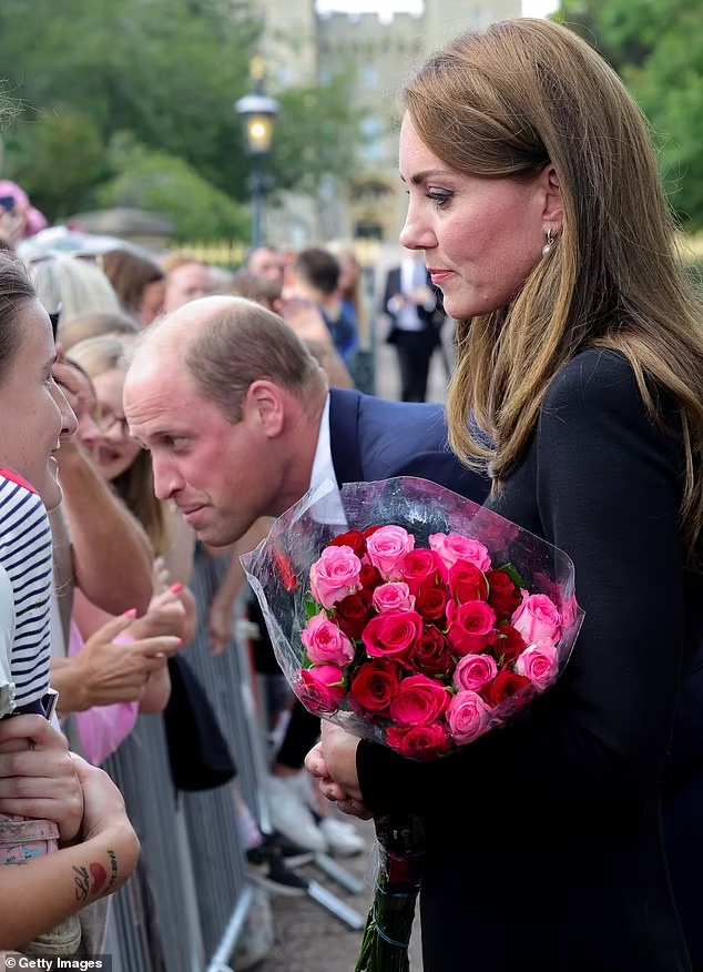 Kate and William inspected floral tributes left outside the gates of the Berkshire estate for Her Majesty, who passed away in Balmoral Castle at the age of 96.
