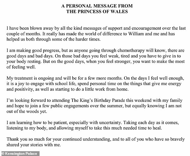 Kate is expected to be present at the official birthday parade tomorrow and is believed to be riding a carriage with her children before stepping out on the balcony to accompany other senior members of the royal family.