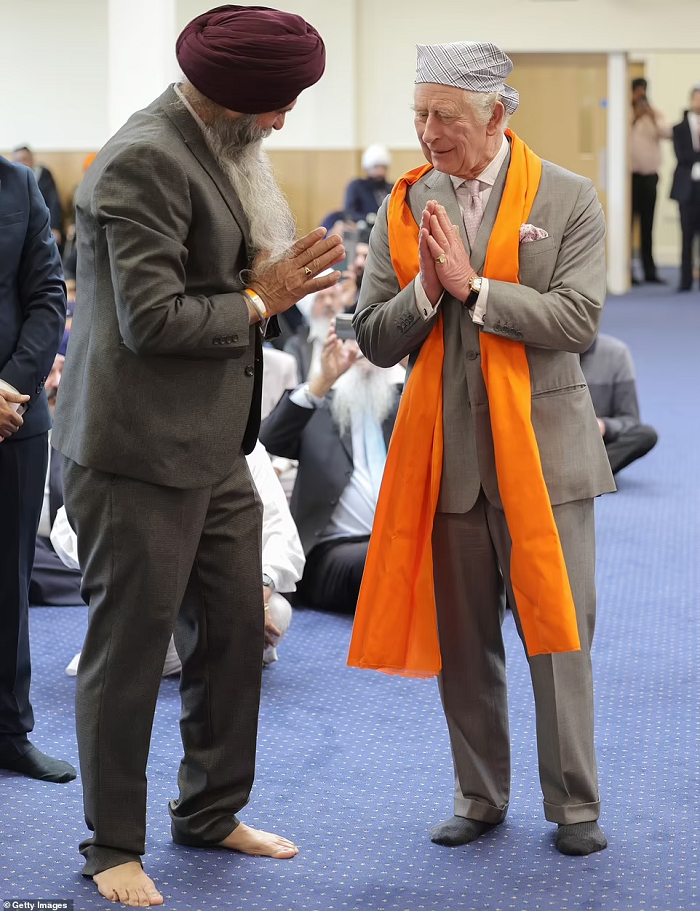 The monarch also bowed in front of the Sikh holy book, Guru Granth Sahib, and sat cross-legged on the floor.
