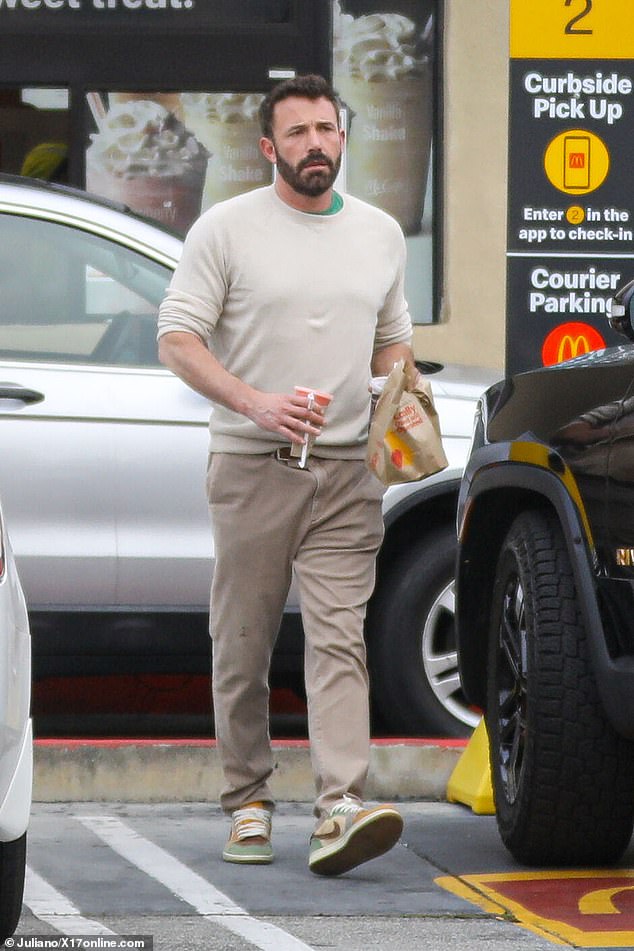 Affleck was certainly appearing pensive while strolling his car in a backward direction while donning a cream-toned sweater that came with a pair of sweatpants in tan as well as sneakers.