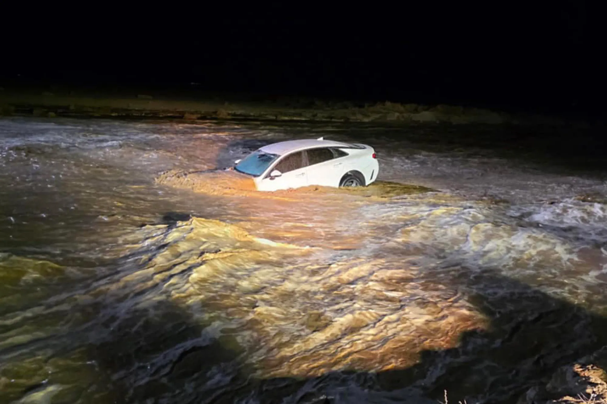 The duo was trying hard to cross a flooded area of a road on Main Street when their vehicle was swept off the roadway by floodwaters.