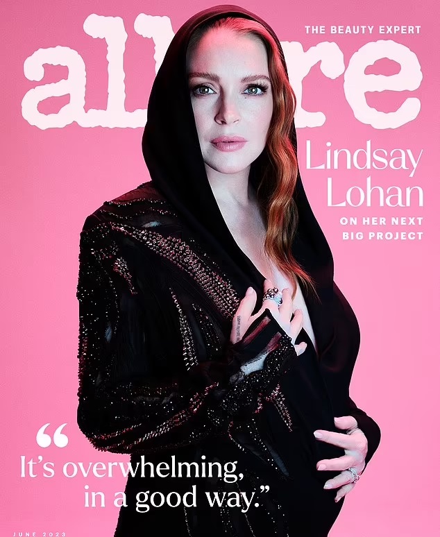 The 36-year-old Mean Girls star cradled her baby bump as she posed for the Allure Magazine cover in a black crop top and matching pants.