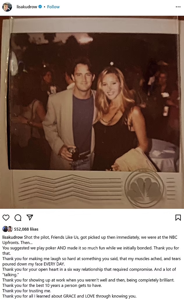 In her heartbreaking post, Kudrow shared: “Shot the pilot, Friends Like Us, got picked up then immediately, we were at the NBC Upfronts. Then… You suggested we play poker AND made it so much fun while we initially bonded. Thank you for that.