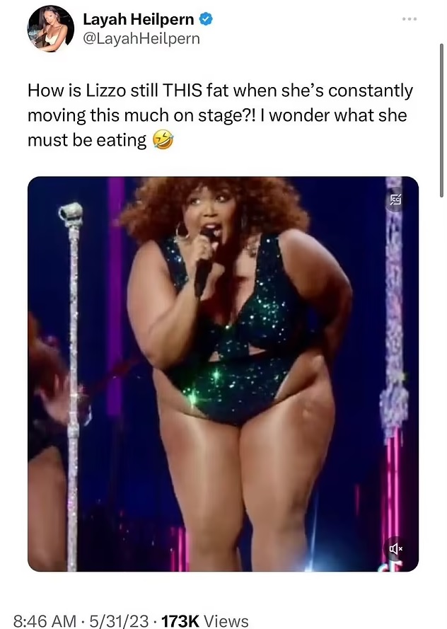 The original comment read: “How is Lizzo still THIS fat when she’s constantly moving this much on stage?! I wonder what she must be eating.”