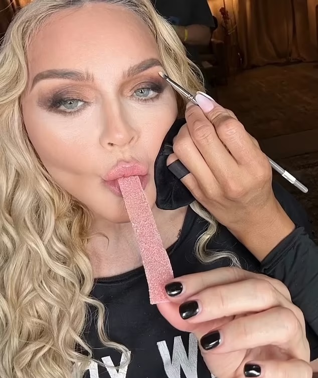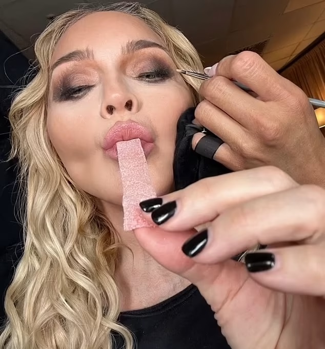 In the viral photos, the 65-year-old Queen of Pop sucked seductively on sour strip candies while sitting in a chair and getting her makeup done.