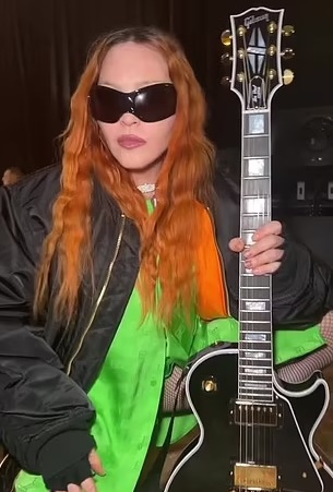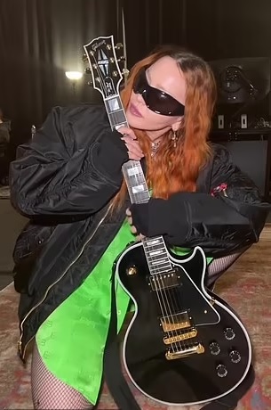 In her pictures, the 64-year-old queen of pop stuck out her tongue and licked her instrument while squatting down in her neon green shirt dress, a dark bomber jacket, fishnet tights, and her iconic shades.