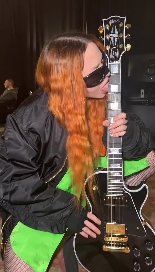 The Like A Virgin hitmaker also flaunted her orange tresses as she moved her fingers across the strings of the instrument and leaned in for a French kiss with the guitar.