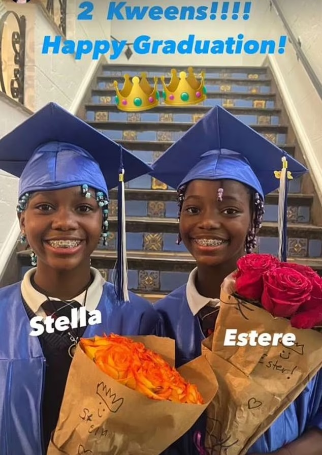 Madonna celebrated her twin daughters’ elementary school graduation with a sweet photo showing the two girls in blue gowns and caps.