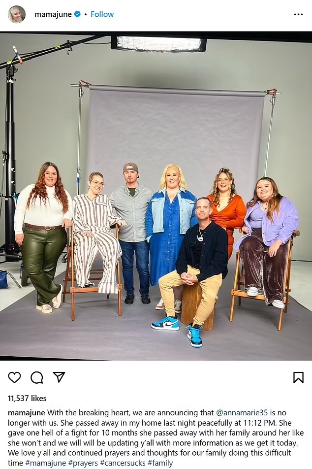 “With the breaking heart, we are announcing that @annamarie35 is no longer with us. She passed away in my home last night peacefully at 11:12 PM,” June wrote.