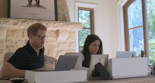 In a clip showing Meghan and Harry checking their gadgets from behind their desk, Meghan can be heard telling Harry: “Beyoncé just texted. I still can’t believe she knows who I am.”