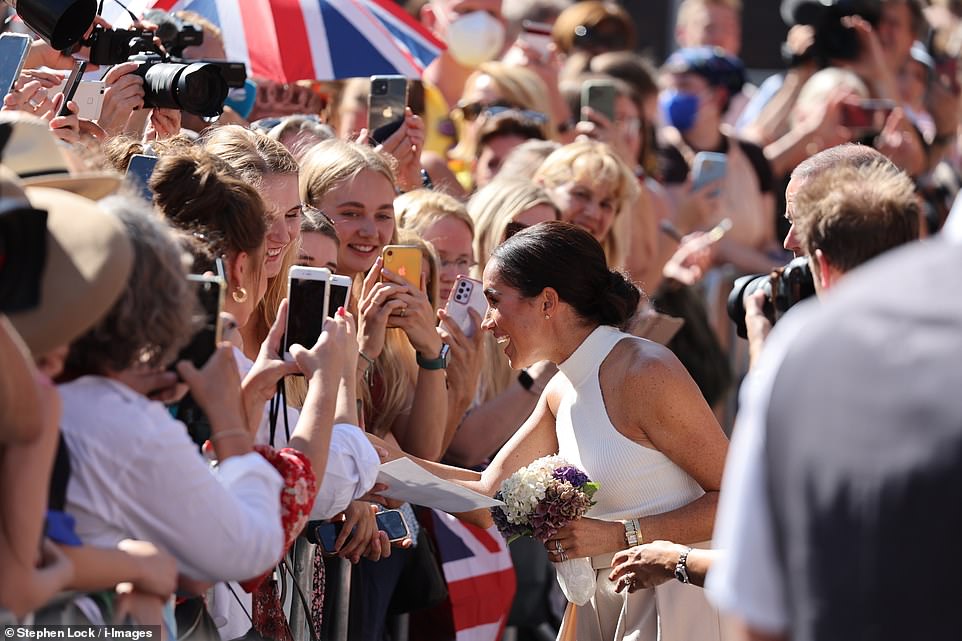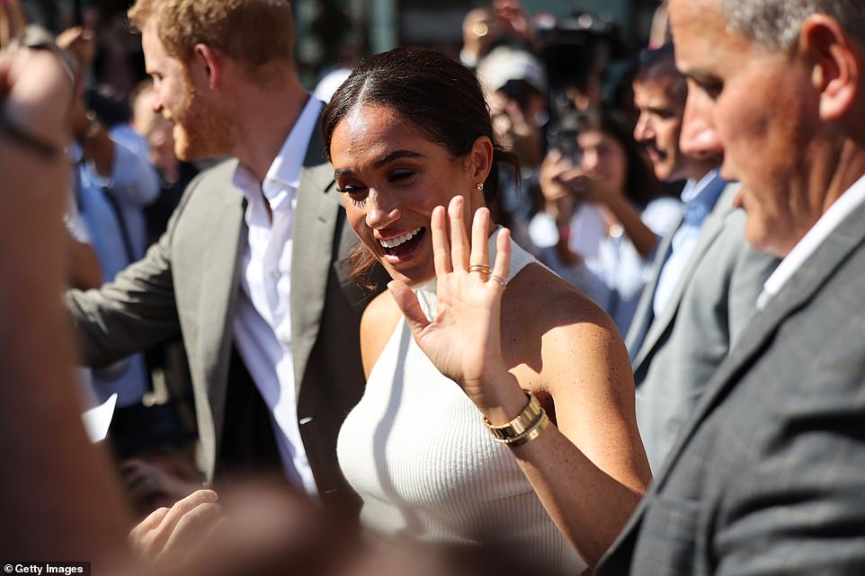 Meghan opted for a radiant ensemble in cream and flashed a very beaming smile while waving at the crowds, hand in hand with her husband Prince Harry.