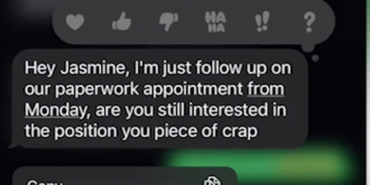 The message referred to Jasmine as a piece of crap but she certainly wasn’t expecting that to come her way, all of a sudden.