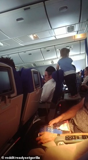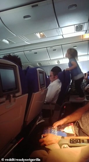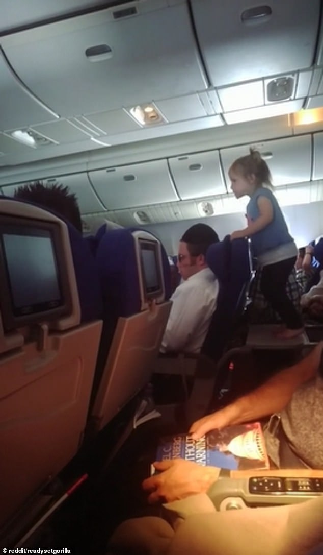 The daughter is seen running amock on the long flight as terrified passengers witness the ordeal in shock and horror.
