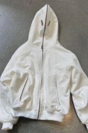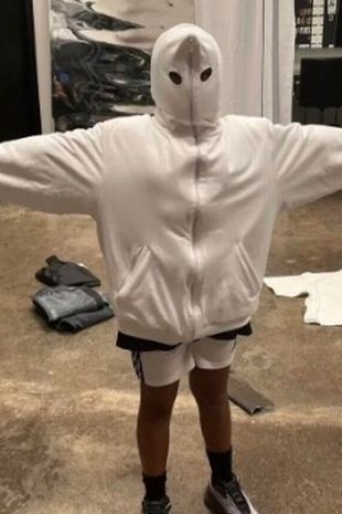 The dress is from season 9 of the star’s fashion collection. And it features a white-colored zip-up design that has a pointed hood that ends up covering the face and has tiny circles in place for the eye area.