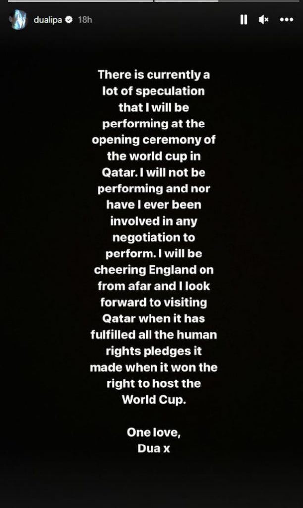 Dua wrote on her social media post, ‘There is currently a lot of speculation about me performing at the FIFA World Cup Ceremony in Qatar and I’ve never been involved in such negotiations and neither do I intend to do so”- she continued.