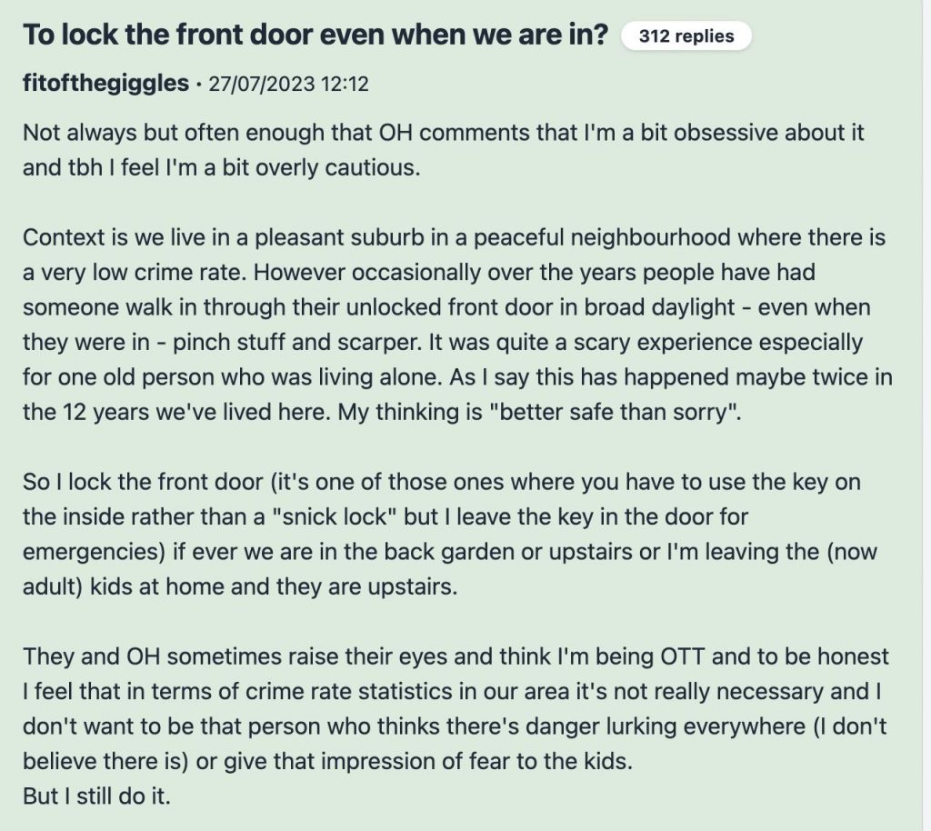 But another agreed and said she only needs to lock it at night because most of the threat is then. A third commented on how locking doors makes it tougher to exit in the case of an emergency.