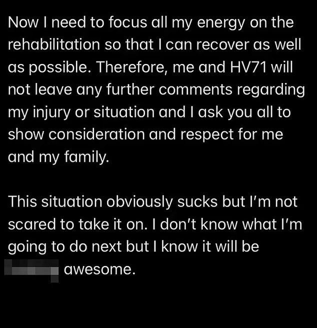 “Now I need to focus all my energy on the rehabilitation so that I can recover as well as possible,” she went on, adding that she and her team won’t leave more details about her situation.
