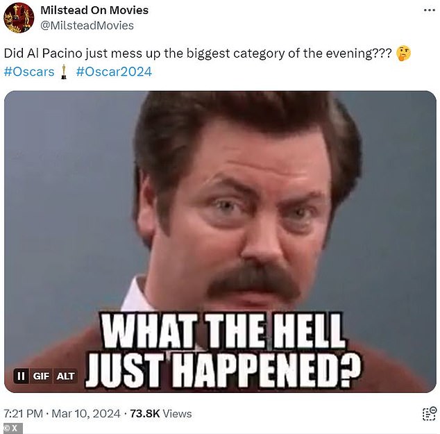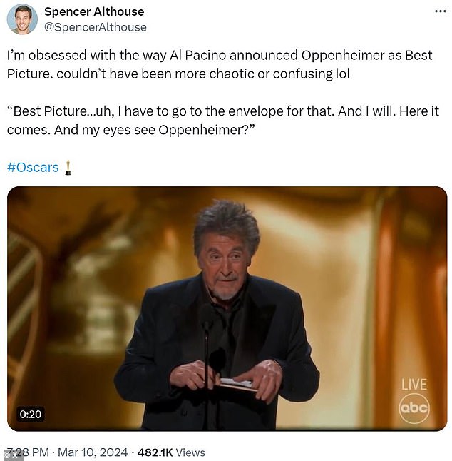 Pacino was roasted online after he forgot to announce the nominees in that respective category and straight up went on to open the envelope and announce the winner, which happened to Oppenheimer.